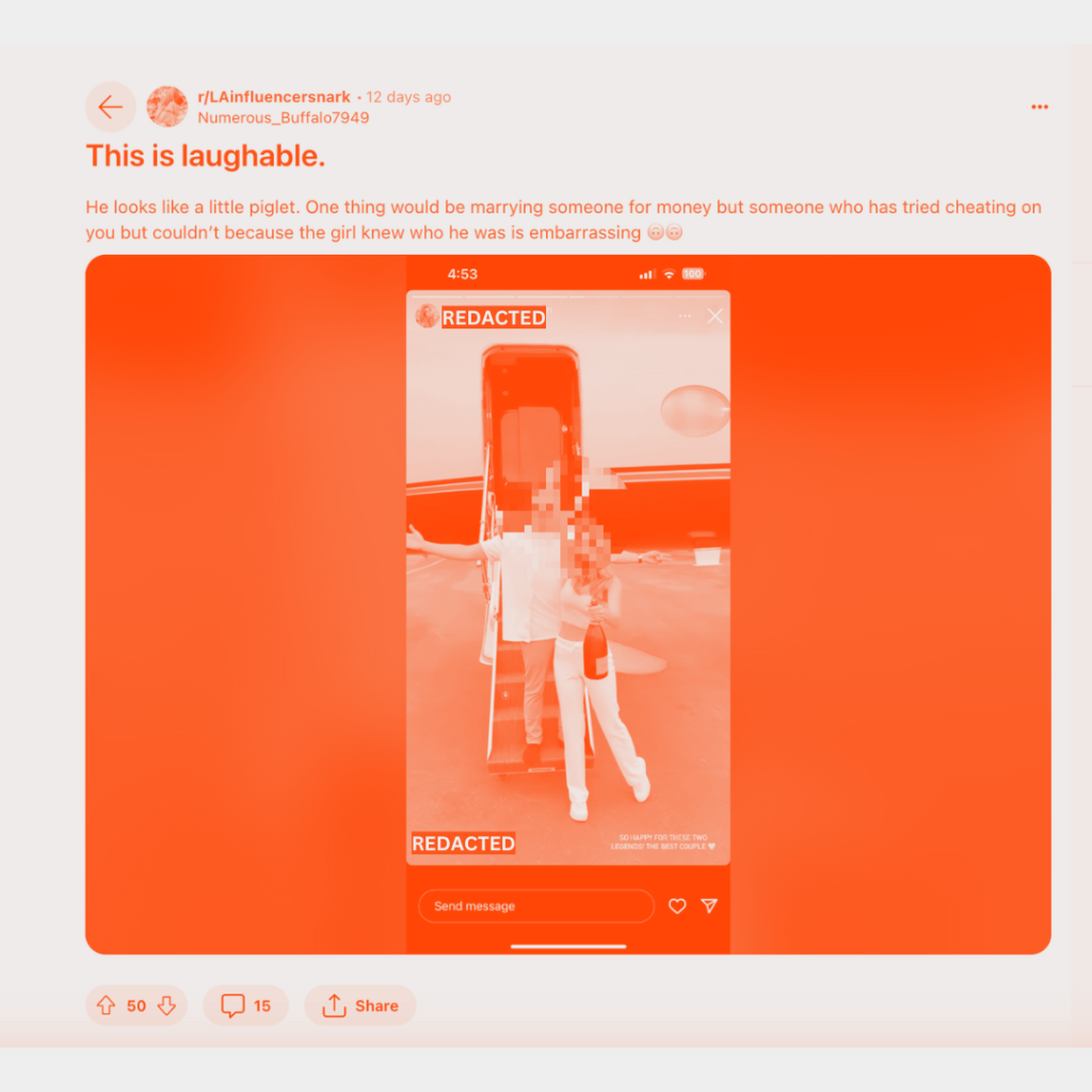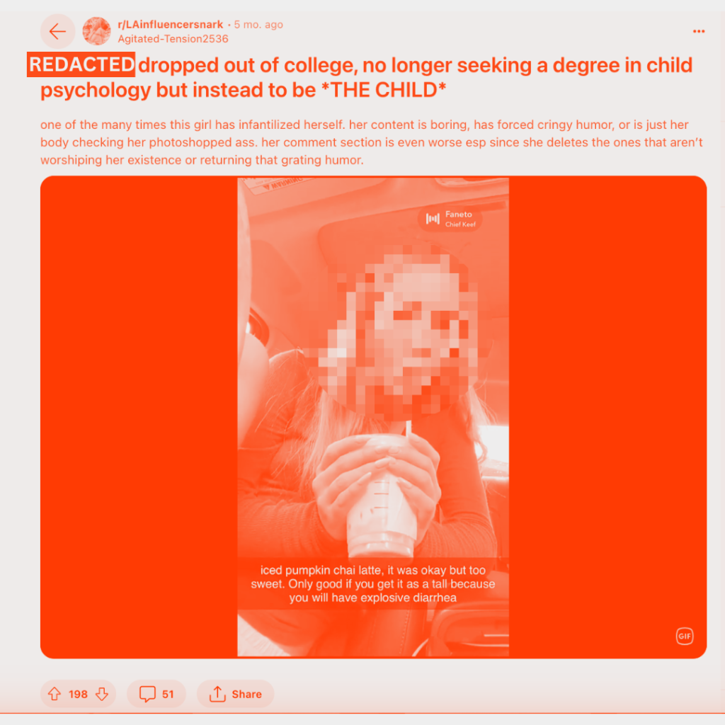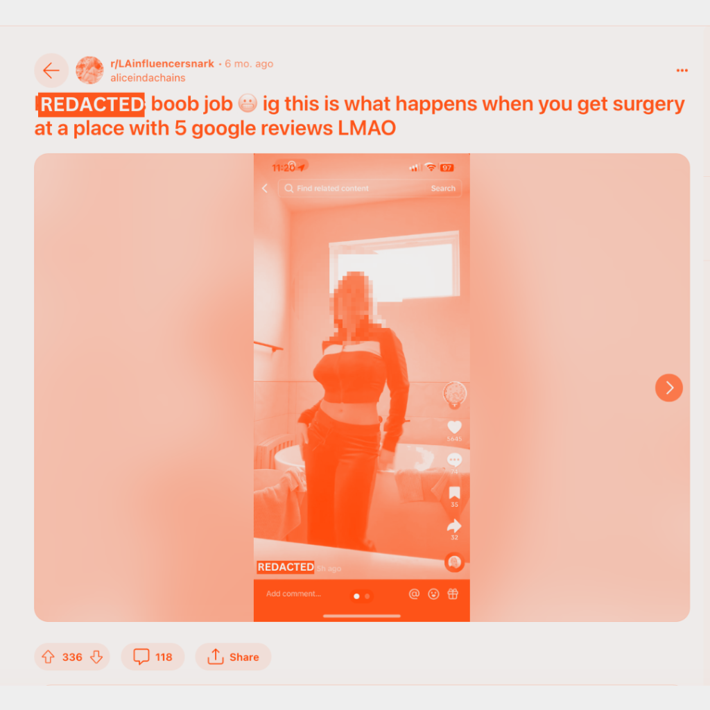 For the purposes of this article and to prevent further perpetuation of negativity, influencers’ identities have been obscured in the post visuals. Readers can visit snark Reddit pages at their own discretion, but this piece is intended to be read without the need to engage with the subreddits.