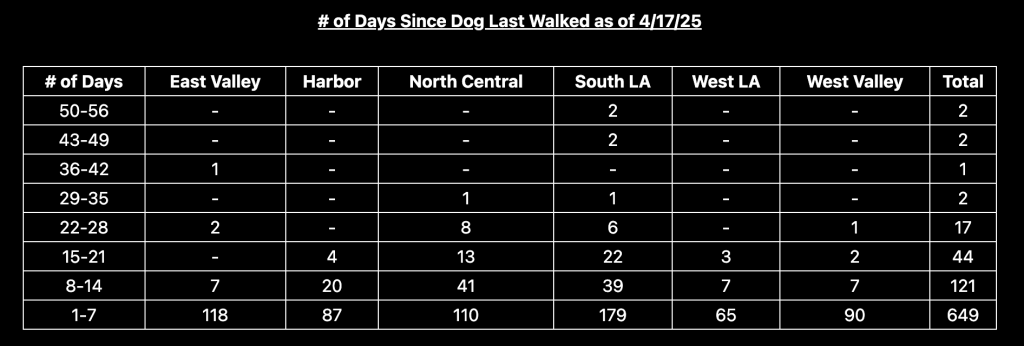 One of the most troubling issues revealed in the transparency reports is the lack of exercise for a significant portion of dogs under LAAS care. The data shows that many dogs across shelters have gone extended periods without being walked, spending the majority of their time confined to small cement cages with minimal stimulation. This lack of exercise directly contributes to heightened stress and behavioral problems like anxiety and aggression, making these dogs more likely to end up on the euthanasia list. On average, dogs in LAAS shelters are walked only once every 8-14 days—far below what is necessary to maintain a healthy, well-adjusted animal.