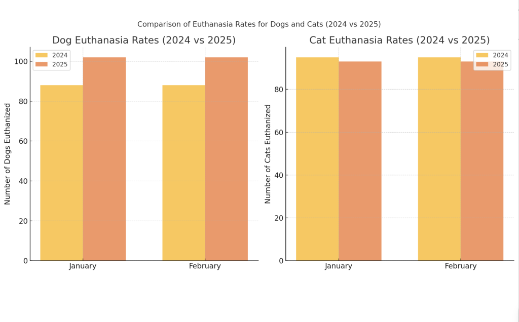 As of April 2025, the LAAS Woof Stat report, which outlines the department’s official statistics on a monthly basis, has posted data for January and February 2025. Euthanasia rates for cats and kittens have slightly decreased compared to the same period in 2024, however, dog euthanasia has increased 16%. If this trend continues, dog euthanasia will likely rise significantly over the remainder of the year. Additionally, spring and summer, peak kitten birth seasons, are expected to drive a further increase in cat and kitten euthanasia rates.